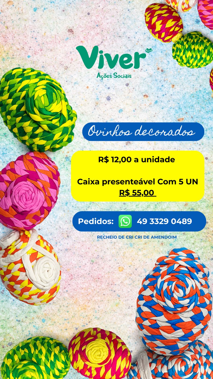O Programa Viver Ações Sociais iniciou em Chapecó as vendas dos ovinhos de Páscoa decorados e recheados com cri-cri de amendoim. Os pedidos podem ser feitos via WhatsApp ou na sede do Viver.