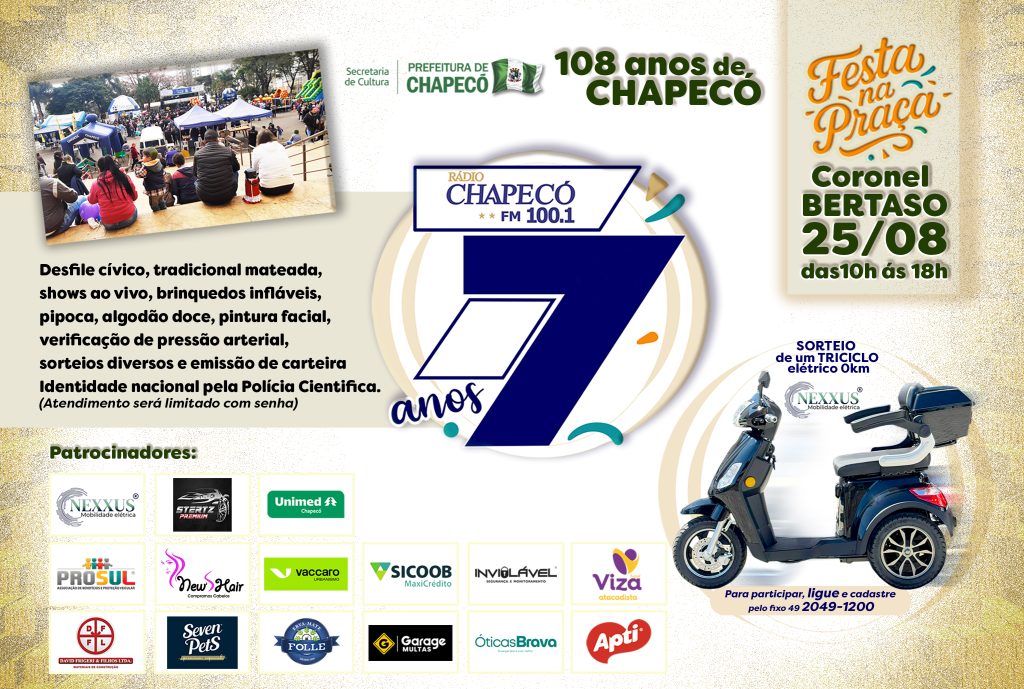 Evento comemora também os 108 anos de Chapecó com programação especial e parcerias estratégicas que fortalecem a cultura local No próximo dia 25 de agosto, a Rádio Chapecó FM 100.1 celebra seus 77 anos de história, consolidando-se como um verdadeiro símbolo de identidade, comunicação e tradição no Oeste catarinense. Fundada em 1948 como Rádio Sociedade Oeste Catarinense Ltda, a emissora foi a pioneira e desde então, tem se destacado por sua programação jornalística, esportiva e cultural, sempre próxima da comunidade. A data tem um significado ainda mais especial, pois marca também os 108 anos de fundação oficial de Chapecó. Para celebrar este duplo aniversário, a Rádio Chapecó prepara uma programação especial, com eventos, transmissões ao vivo e atrações culturais, contando com o apoio fundamental de seus patrocinadores. “Nossos patrocinadores são parte essencial dessa trajetória. Mais do que apoiadores, são parceiros que acreditam na força da Rádio Chapecó FM e na importância de celebrarmos a história de Chapecó juntos”, destaca a direção da emissora. PARCEIROS QUE ESTARÃO NA PRAÇA DIA 25/08 NEXXUS MOBILE SICCOB MAXICREDITO PROSUL PROTEÇÃO VEICULAR STERTZ PREMIUM NEWS HAIR VACCARO URBANISMO UNIMED CHAPECÓ VIZA ATACADISTA GARAGE MULTAS APTI ALIMENTOS ÓTICAS BRAVA DAVID FRIGERI & FILHOS INVIOLÁVEL SEGURANÇA SEVEN PETS ERVA MATE FOLLE DIA 25 DE AGOSTO, VOCÊ E SUA FAMÍLIA SÃO OS NOSSOS CONVIDADOS ESPECIAIS