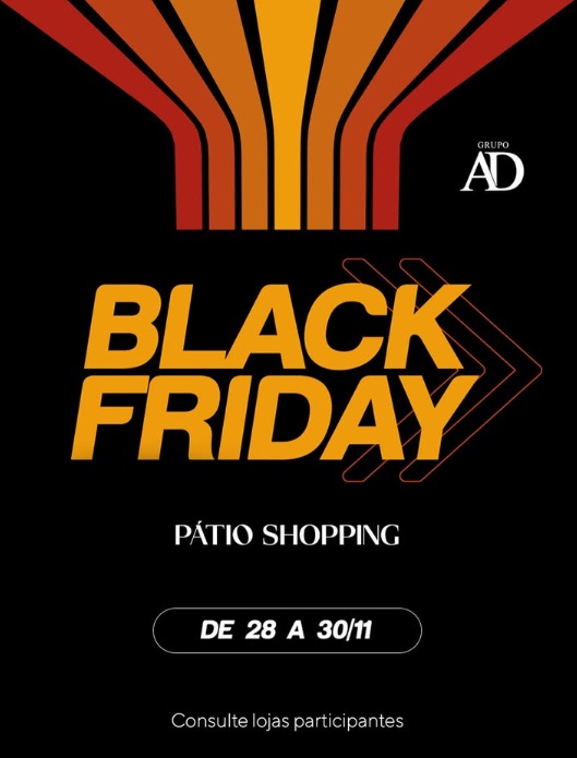 O Pátio Shopping inicia nesta sexta-feira, 28, a campanha de Black Friday com descontos que podem chegar a 70% em produtos e serviços de diferentes segmentos. A ação se estende até domingo, 30, e envolve itens de moda, calçados, joalheria, cosméticos, eletroeletrônicos, decoração, alimentação e acessórios. A proposta é oferecer ao público três dias de preços reduzidos em ofertas exclusivas dentro do empreendimento.