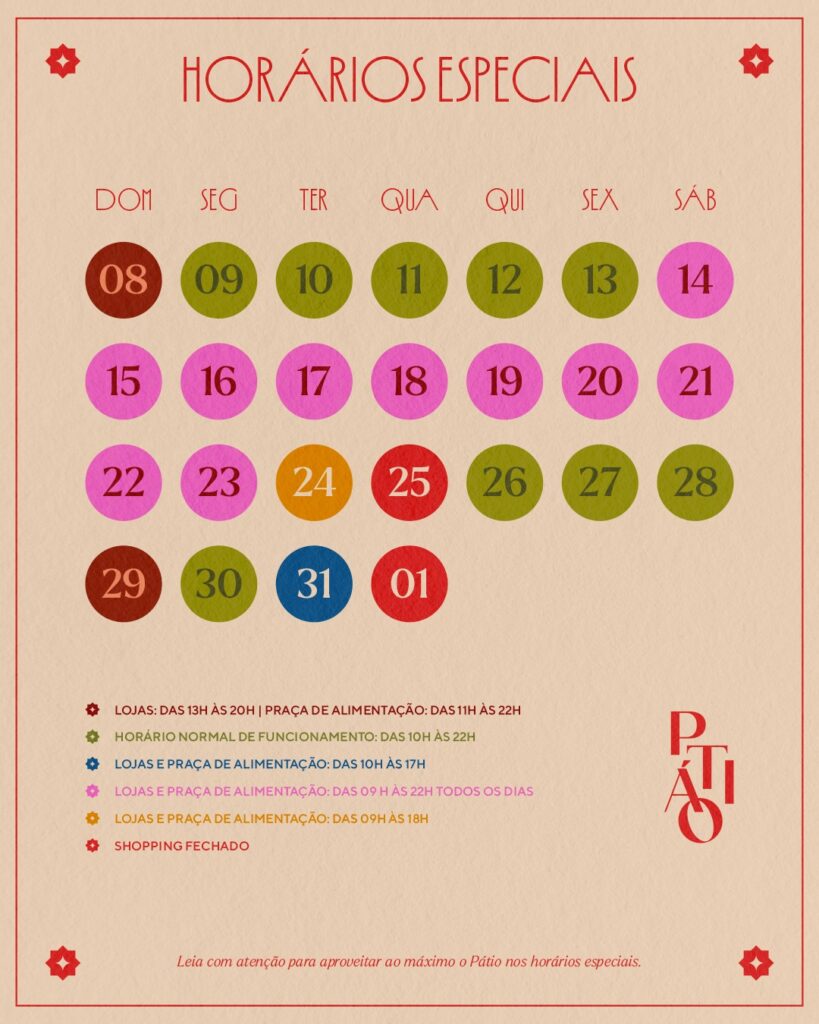 O Pátio Shopping irá funcionar em horários especiais neste fim de ano. Preparado para receber o público nas tradicionais compras de fim de ano, o empreendimento definiu horário especial de abertura a partir deste sábado, 14 de dezembro, com abertura uma hora antes do normal. Ou seja, o atendimento passará a ser das 9h às 22h, até o dia 23 deste mês.