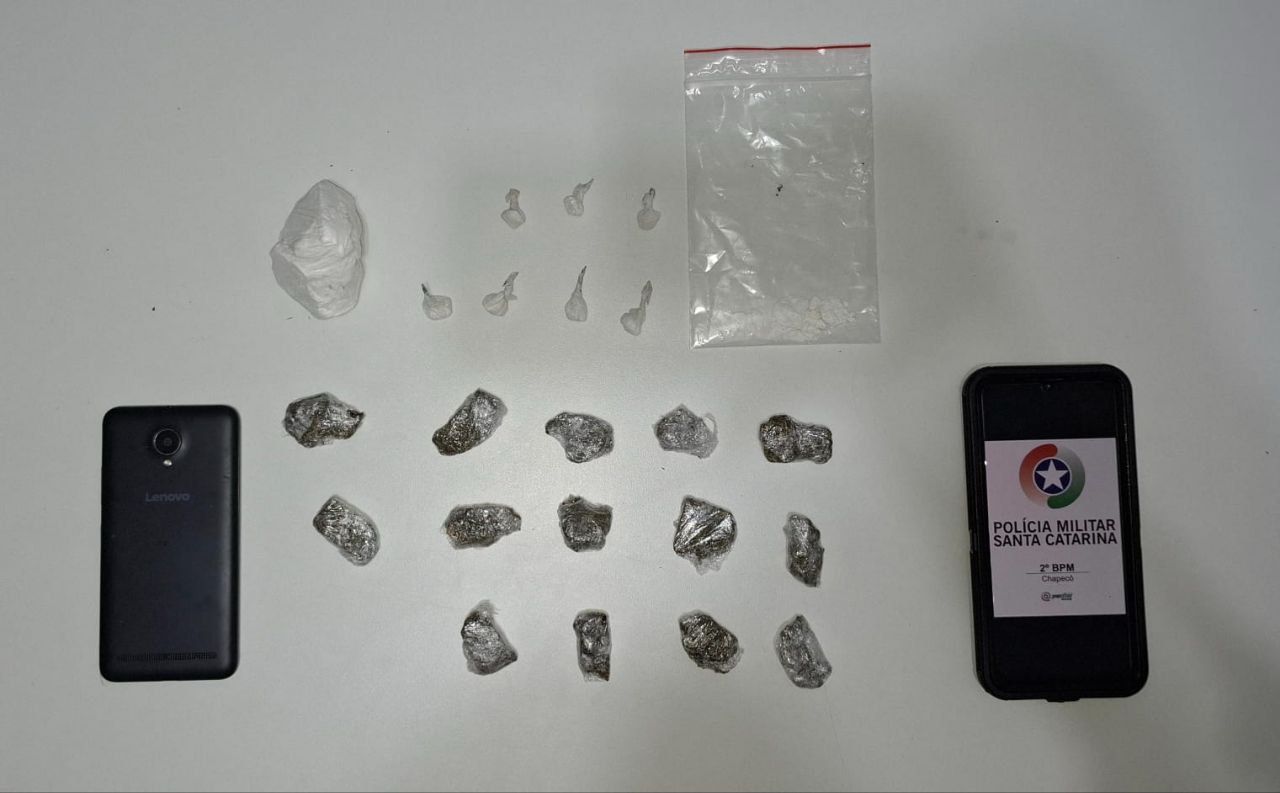 Na busca pessoal, os policiais encontraram sete porções de cocaína prontas para a venda. Já no imóvel onde o suspeito tentou entrar foram apreendidos um celular, 14 porções de maconha, uma porção grande de cocaína (55g) e diversos materiais usados para fracionamento e embalo da droga.