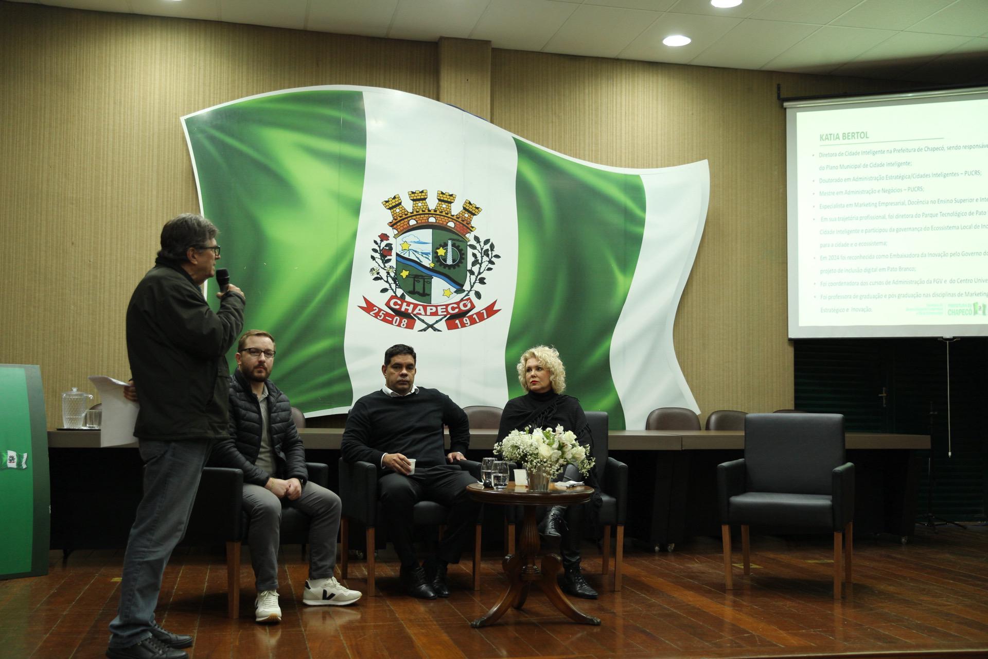 O Secretário de Desenvolvimento Econômico, Turismo e Inovação, Márcio da Paixão Rodrigues, falou sobre o Programa Chapecó Inovadora, que estabelece conexão com as universidades e todo o ecossistema de inovação, com o objetivo de buscar soluções para melhorar o atendimento ao público.
