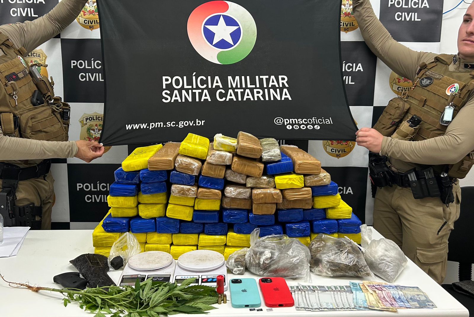 A Polícia Militar de Santa Catarina apreendeu aproximadamente 58 quilos de maconha, além de haxixe, munições e dinheiro, durante uma ação realizada no início da tarde desta sexta-feira (30), no bairro Vila Sésamo, em Xanxerê. A ocorrência foi atendida por equipes do 30º Batalhão de Polícia Militar de Fronteira (BPM/Fron).