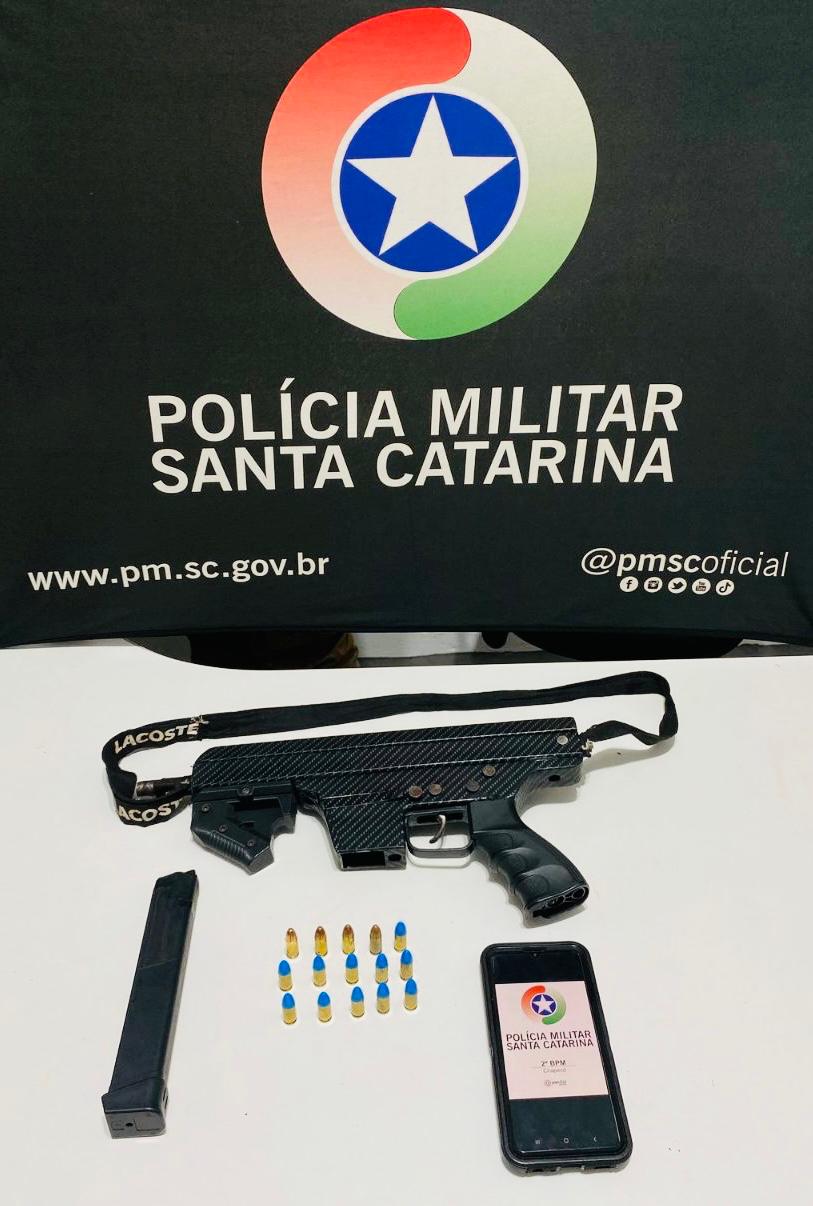 Um homem de 33 anos foi detido pela Polícia Militar na noite de terça-feira (29), em frente à uma universidade no bairro Efapi, após ser flagrado com uma submetralhadora e munições de uso restrito no interior de seu veículo.
