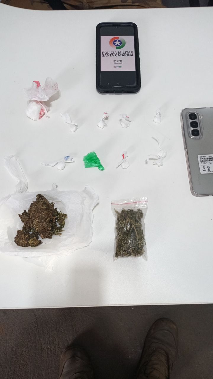 Na tarde de quinta-feira (18), a guarnição da ROCAM do 2°BPM/Fron de Chapecó prendeu um homem de 26 anos por tráfico de drogas no Bairro Efapi. A ação resultou na apreensão de cocaína, maconha e um celular.
