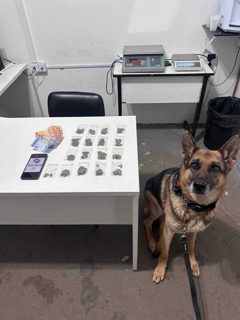 Com o apoio da guarnição do Canil e do cão Royce, foram localizadas mais 15 porções de maconha escondidas em um entulho próximo, totalizando 56 gramas de droga.