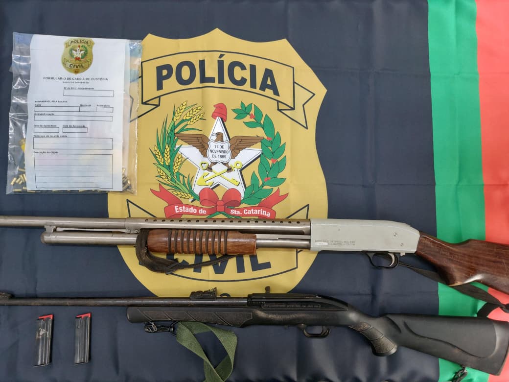 A prisão ocorreu durante o cumprimento de um mandado de busca e apreensão na zona rural do município. No local, os policiais apreenderam uma espingarda calibre 12, um rifle calibre 22 e diversas munições correspondentes.