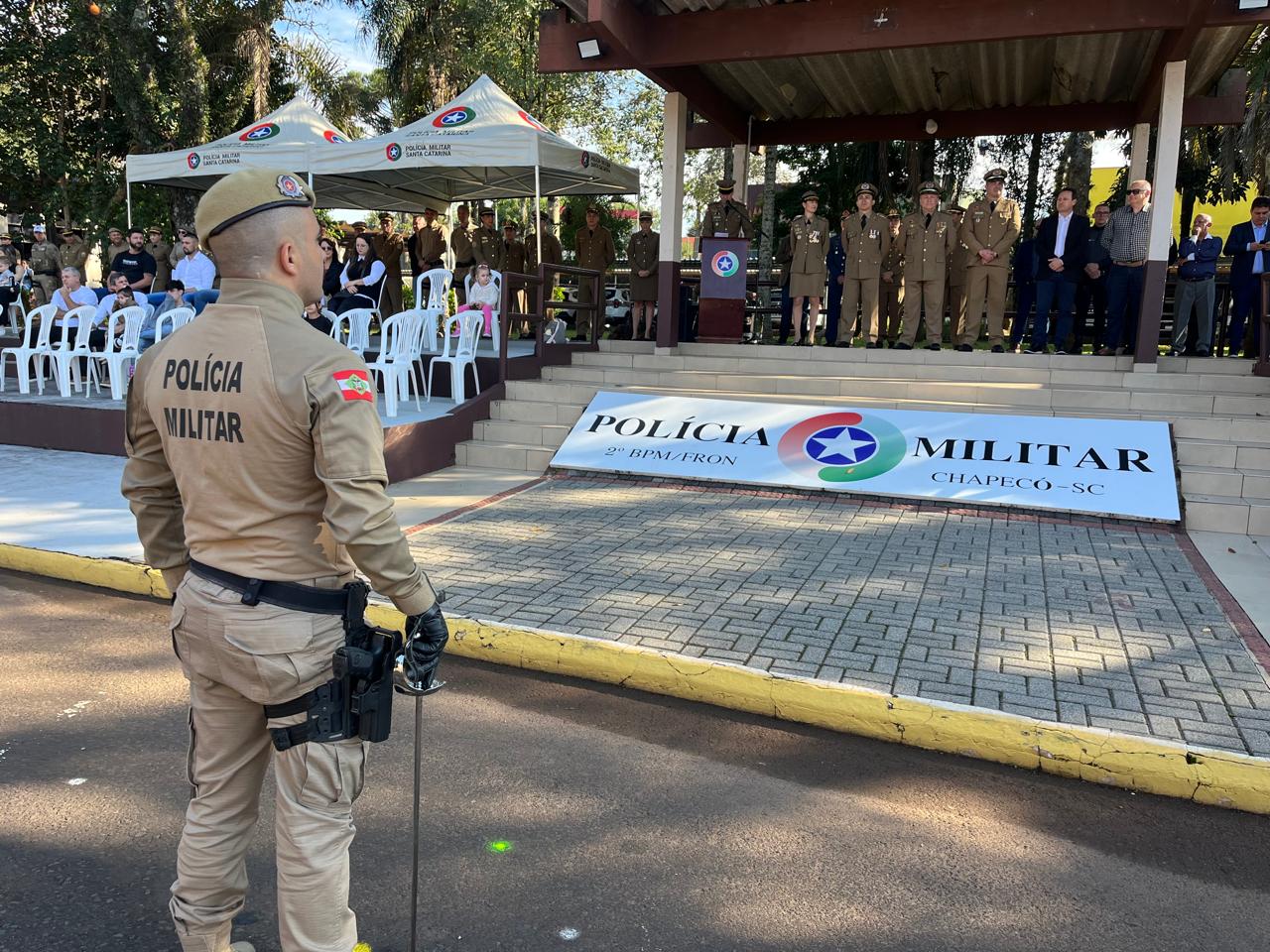 A Polícia Militar de Santa Catarina (PMSC) celebra hoje 06 de maio de 2025, 190 anos de serviços prestados à população. Para marcar a data, uma série de solenidades estão sendo realizadas em todo o estado. Em Chapecó, a cerimônia comemorativa foi realizada nesta manhã. Os atos ocorreram no pátio do 2º Batalhão de Polícia Militar de Fronteira.