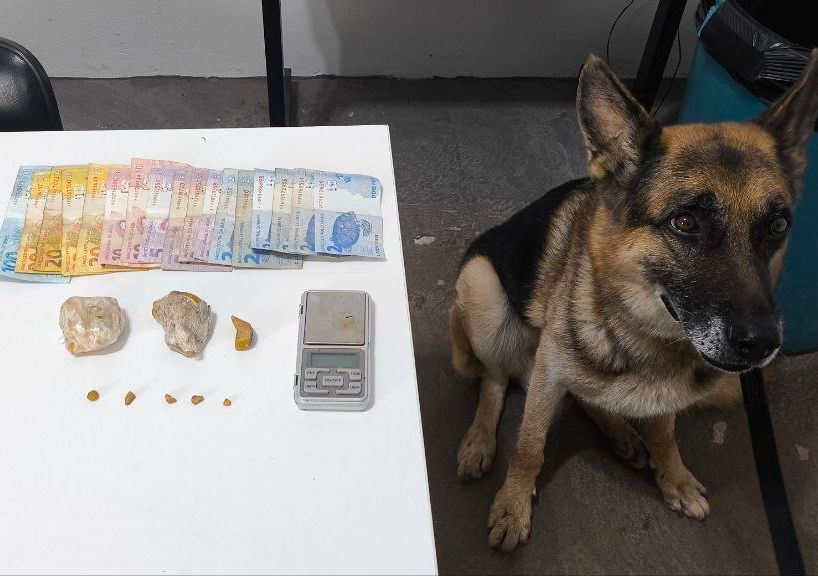 Na revista pessoal, foram encontradas cinco pedras de crack e R$ 232. Com apoio do canil, os policiais localizaram a sacola dispensada durante a fuga, contendo cerca de 70,8 gramas de crack e uma balança de precisão.