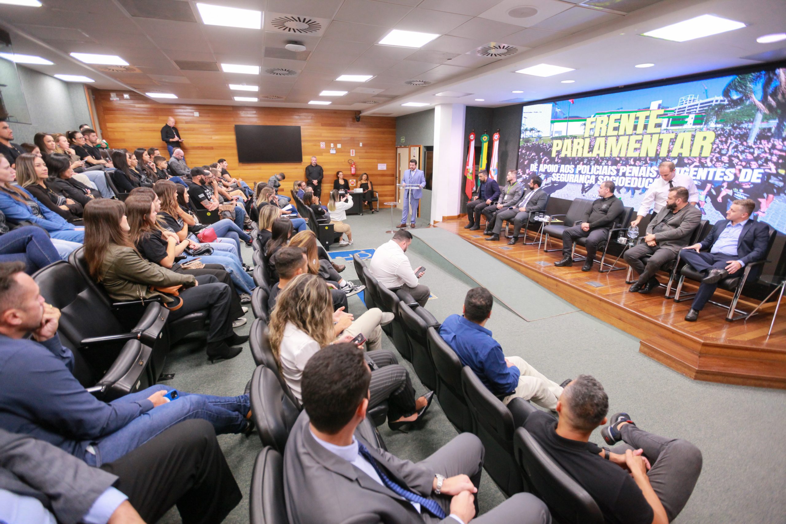 A Assembleia Legislativa de Santa Catarina instituiu, na noite de quarta-feira (30), a Frente Parlamentar de Apoio aos Policiais Penais e Agentes de Segurança Socioeducativos. A iniciativa visa promover debates e ações voltadas à valorização desses profissionais, com foco nas condições de trabalho, remuneração e reestruturação dos planos de carreira. O lançamento da frente ocorreu no Plenarinho Deputado Paulo Stuart Wright e contou com a presença de parlamentares, representantes da Secretaria de Estado de Justiça e Reintegração Social, lideranças das categorias e servidores públicos.
