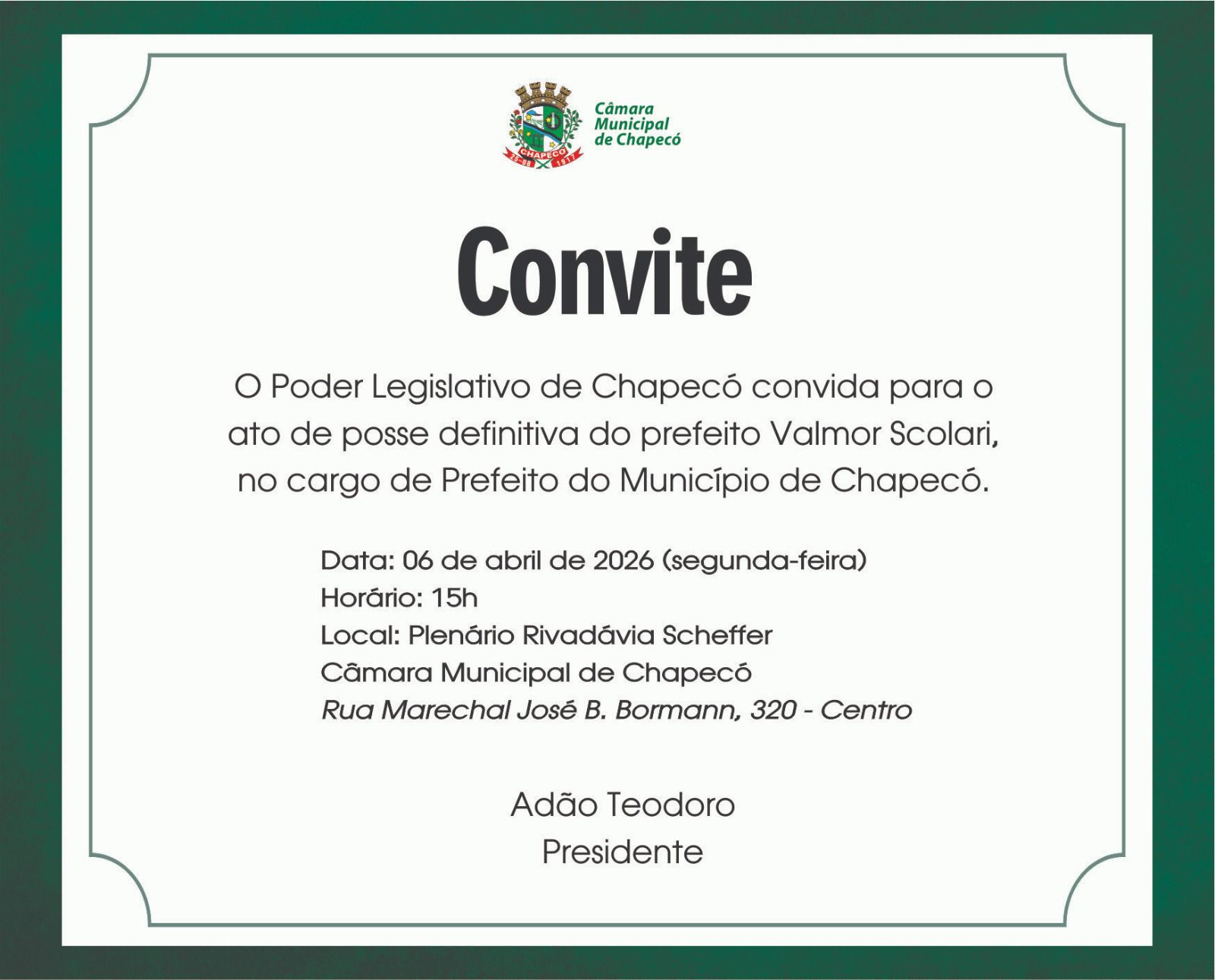 A solenidade será conduzida pelo presidente da Câmara Municipal de Chapecó, vereador Adão Teodoro, e contará com a presença de autoridades, vereadores, lideranças e imprensa.
