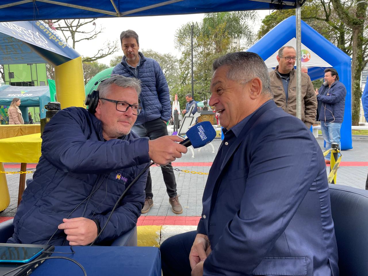 Na manhã desta segunda-feira (25), feriado em comemoração aos 108 anos de Chapecó, o prefeito João Rodrigues e a primeira-dama Fabiane Rodrigues concederam entrevista à Rádio Chapecó, diretamente da Praça Coronel Bertaso, onde participavam das celebrações do aniversário do município.