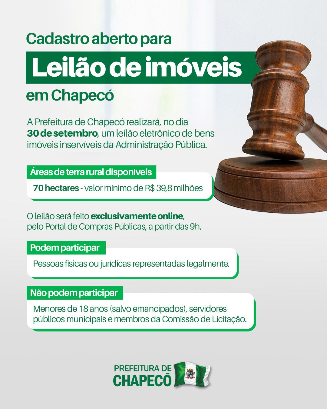 A Prefeitura de Chapecó abriu cadastro para proposta de interessados em participar de licitação na modalidade de leilão a ser realizada no dia 30 de setembro. Serão leiloados bens imóveis inservíveis da Administração Pública e, neste caso, serão duas áreas de terra rural.
