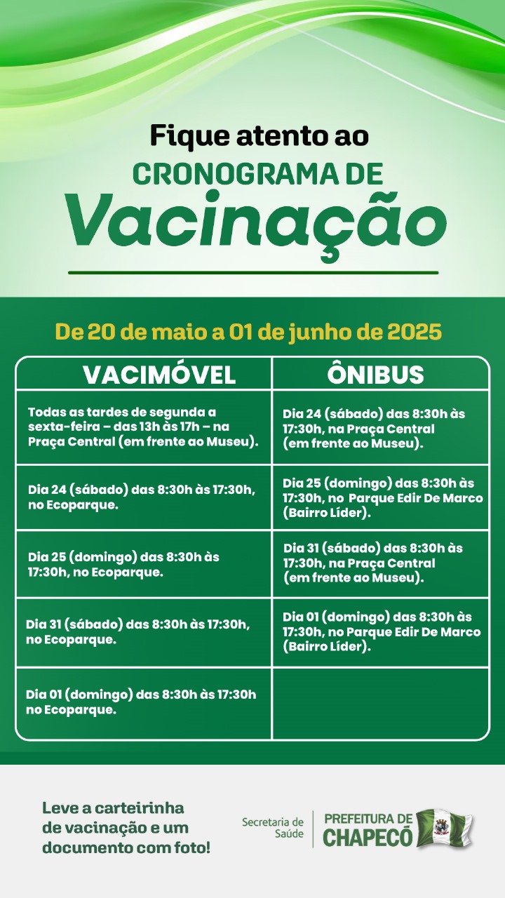 A Prefeitura de Chapecó, por meio da Secretaria de Saúde, vai ampliar a oferta de horários de vacinação com o Vacimóvel e também com o ônibus do programa Saúde em Movimento, no período de 20 de maio a 1o de junho.