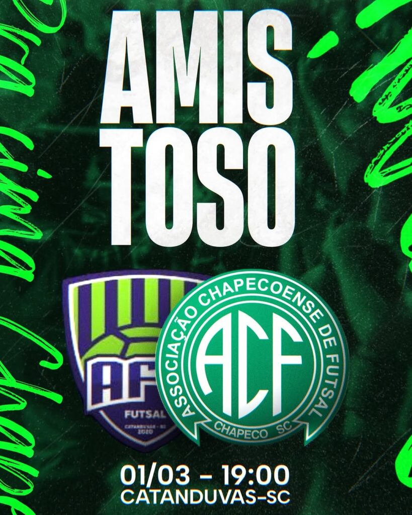 A equipe Prefeitura de Chapecó/Chapecoense Futsal/Unochapecó faz o primeiro amistoso em 2025 neste sábado (1), às 19h. O Verdão das Quadras enfrenta o Catanduvas, atual vice-campeão da Copa SC, fora de casa, no Ginásio Iara Nicoletti.