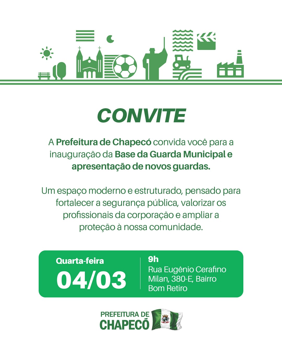 A Prefeitura de Chapecó realiza nesta quarta-feira (4), às 9h, a inauguração da nova Base da Guarda Municipal e a apresentação oficial dos novos agentes que passam a integrar a corporação.