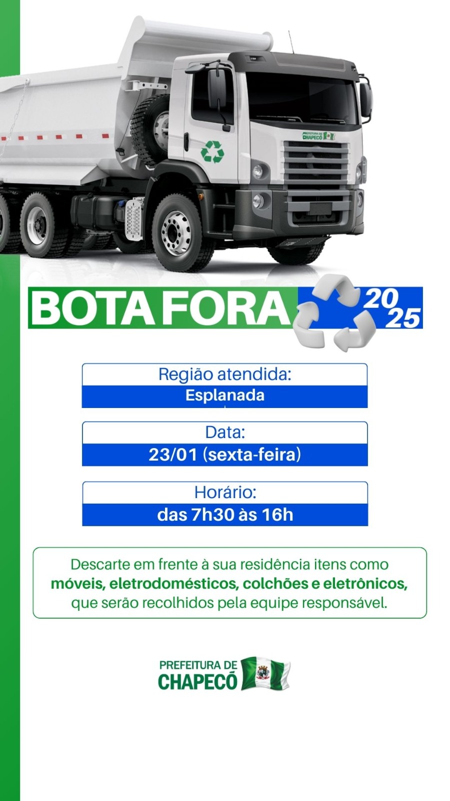 A Prefeitura de Chapecó promove nesta sexta-feira, dia 23 de janeiro, mais uma edição da ação “Bota Fora”, iniciativa que tem como objetivo facilitar o descarte correto de materiais inservíveis e contribuir com a limpeza urbana do município.