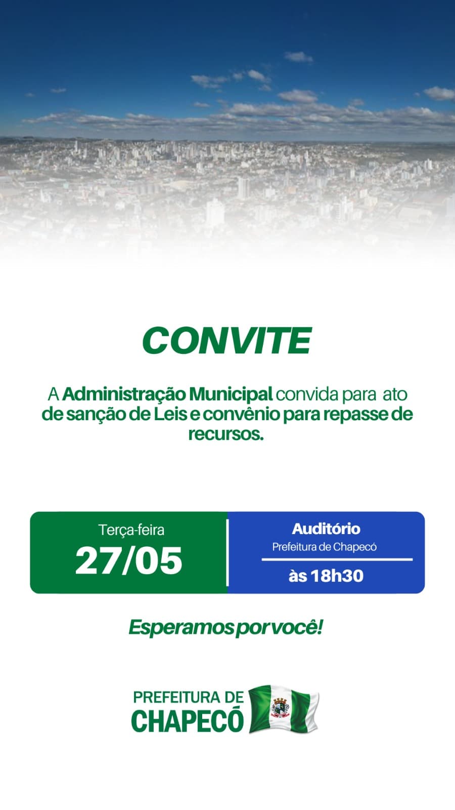A Administração Municipal de Chapecó promove nesta terça-feira, dia 27 de maio, um importante ato oficial voltado à sanção de leis e à assinatura de convênios destinados ao repasse de recursos.