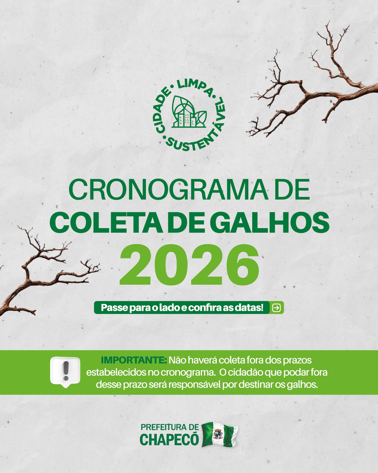 A Prefeitura de Chapecó divulgou o cronograma para a coleta de galhos para os bairros ao longo dos próximos meses. A ação tem como objetivo proporcionar um serviço de qualidade e manter a limpeza e organização dos espaços públicos. A orientação é para que a população faça a poda consciente e observe o cronograma de coleta, evitando o descarte incorreto dos galhos e o acúmulo dos resíduos nas ruas e calçadas.