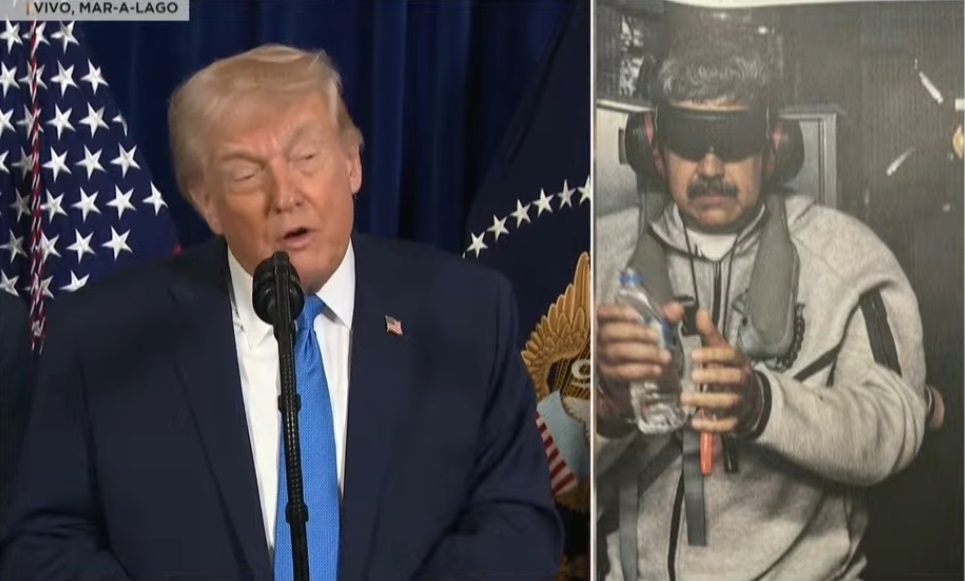 Durante entrevista coletiva à imprensa, Nicolas Maduro aparece vendado segurando uma garrafa plástica; Foto: Reprodução/Meganoticias/Redes sociais