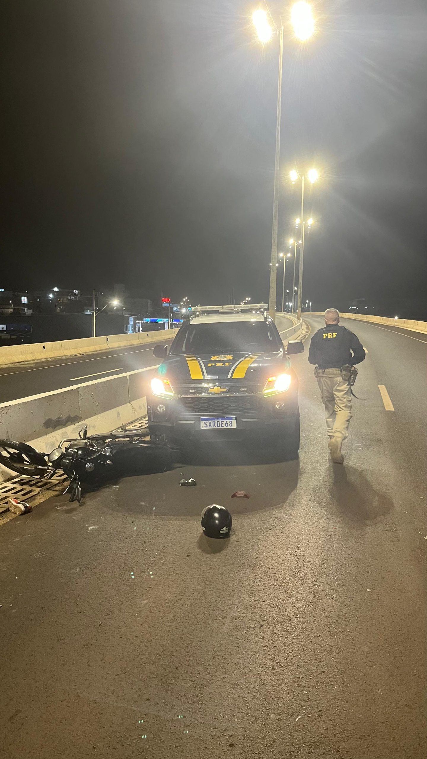 Em determinado momento, ao tentar desviar de um carro, a motocicleta colidiu lateralmente contra a parte frontal da viatura da PRF. Com o impacto, os dois ocupantes caíram ao solo.