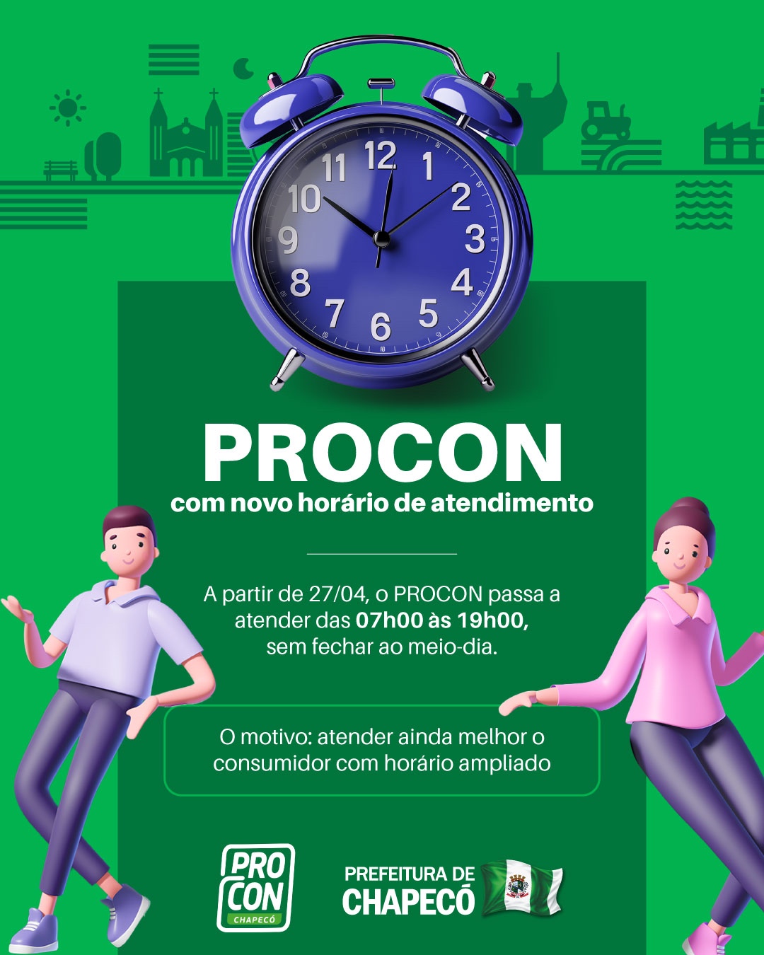 O Procon de Chapecó terá novo horário de atendimento ao público a partir de segunda-feira (27). O órgão passará a funcionar das 7h às 19h, de forma contínua, sem interrupção no horário de almoço. Antes da mudança, o atendimento ocorria das 8h às 11h45 e das 13h15 às 17h30.