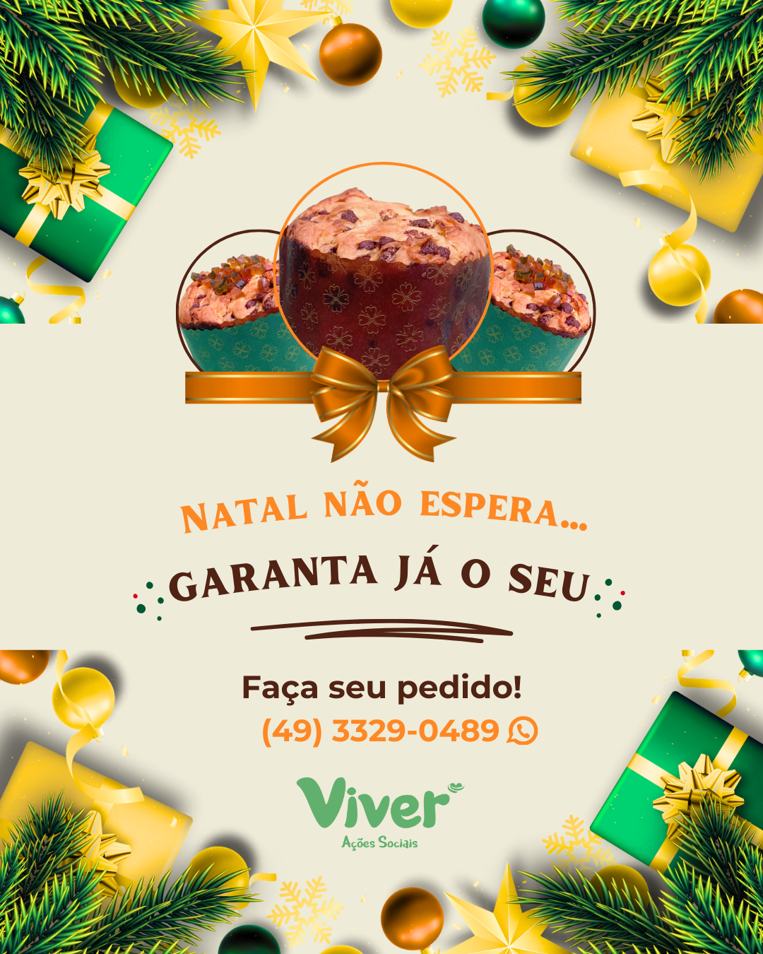Os pedidos podem ser realizados pelo WhatsApp (49)3329-0489, até 16 de dezembro. Já a entrega dos panetones ocorrerá no dia 18 do mesmo mês, na sede do Programa Viver, localizada na Rua Altério Ducatti, 400-E, no Bairro Quedas do Palmital.