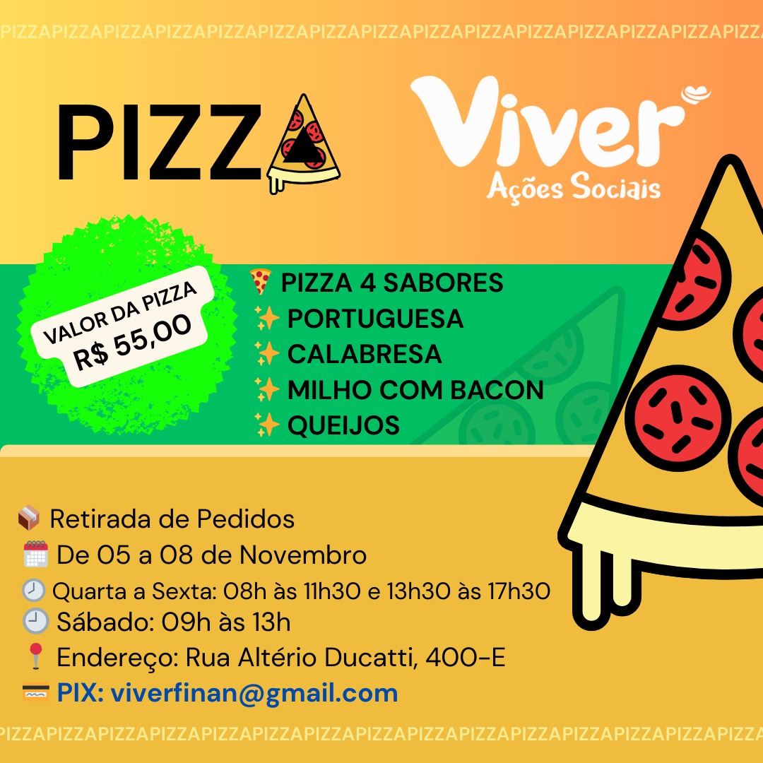 Os interessados podem optar entre quatro sabores de pizza, que são calabresa, portuguesa, queijo e milho com bacon. Com o valor de R$ 55,00 cada, as encomendas podem ser feitas pelo telefone/WhatsApp (49)3329-0484 ou na sede do Viver, localizada na Rua Altério Ducatti, 400-E, no Bairro Quedas do Palmital. O pagamento é somente via pix pela chave viverfinan@gmail.com.