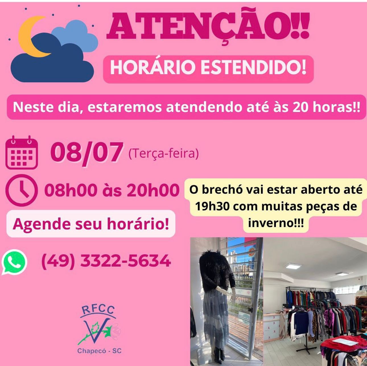 A Rede Feminina de Combate ao Câncer (RFCC) de Chapecó promoverá atendimento em horário estendido nesta terça-feira, 08 de julho, com funcionamento das 08h às 20h.