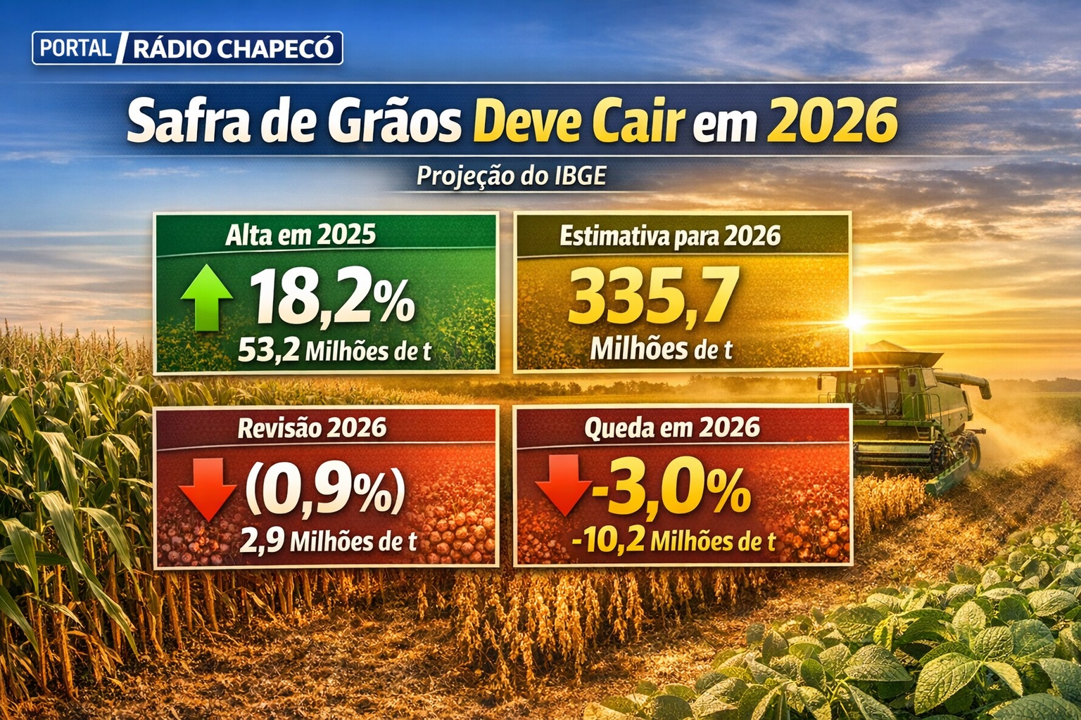 A safra brasileira de grãos — cereais, leguminosas e oleaginosas — deve somar 335,7 milhões de toneladas em 2026, segundo o segundo prognóstico divulgado pelo IBGE. O volume representa um recuo de 3,0% em relação à safra recorde de 2025, o equivalente a 10,2 milhões de toneladas a menos.