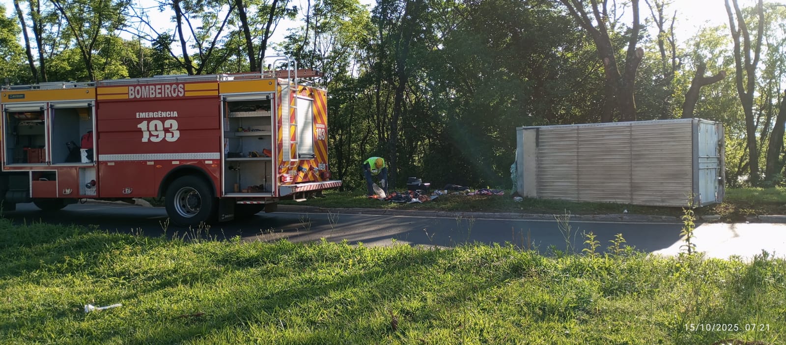 Na manhã desta quarta-feira (15), uma saída de pista seguida de tombamento envolvendo um furgão de cargas mobilizou equipes do 6° Batalhão de Bombeiros Militar em Pinhalzinho. O acidente ocorreu por volta das 6h55min na BR-282, no Trevo Leste.