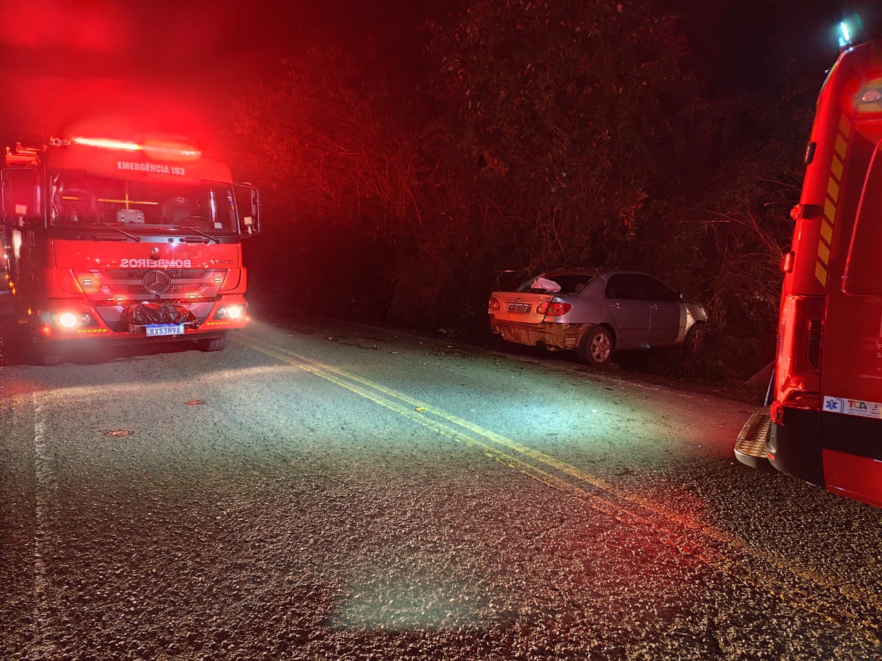 De acordo com os bombeiros, o motorista perdeu o controle da direção ao tentar desviar de um cachorro que estava na pista. Com isso, o carro saiu da estrada e acabou colidindo violentamente contra árvores às margens da rodovia.