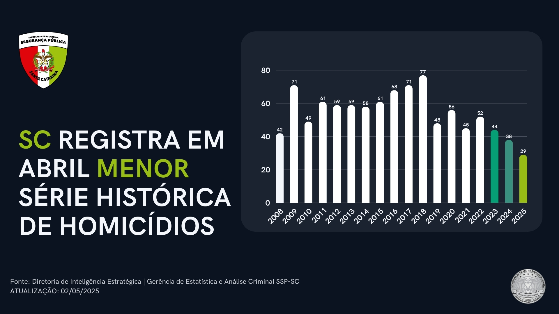 Santa Catarina alcançou em abril de 2025 o menor número de homicídios dos últimos 17 anos, registrando apenas 29 casos. O resultado representa uma queda de 31% em comparação com o mesmo mês em 2008, quando foram contabilizados 42 homicídios. Desde o início da série histórica, em 2008, o pico ocorreu em 2018, com 77 mortes violentas. Os dados integram um relatório da Secretaria de Estado da Segurança Pública, elaborado por meio da Diretoria de Inteligência Estratégica e da Gerência de Estatística e Análise Criminal.