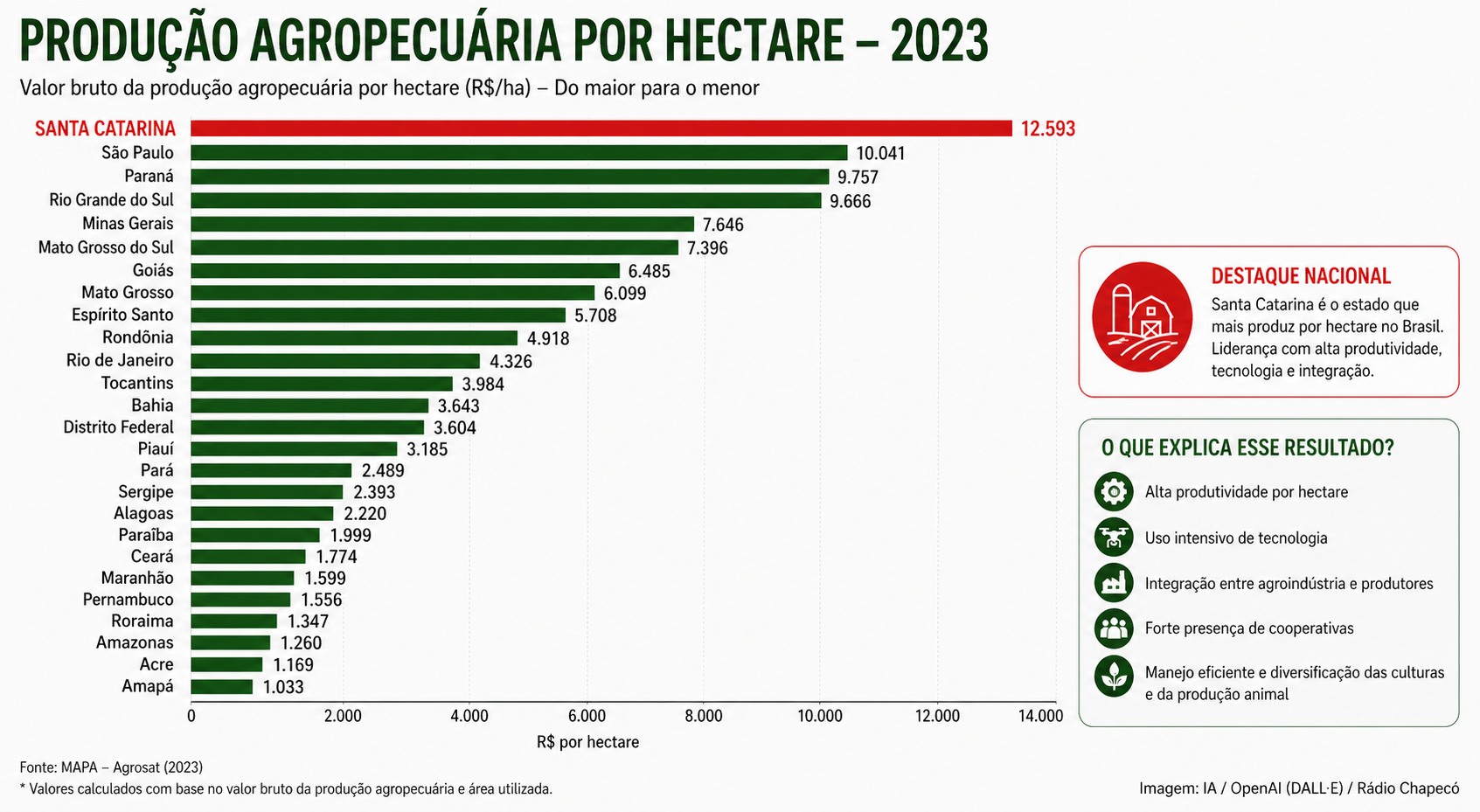 Ou seja, Santa Catarina tem pouca terra disponível em termos relativos, mas está entre os estados que mais geram valor por área, o que explica seu protagonismo no agronegócio.