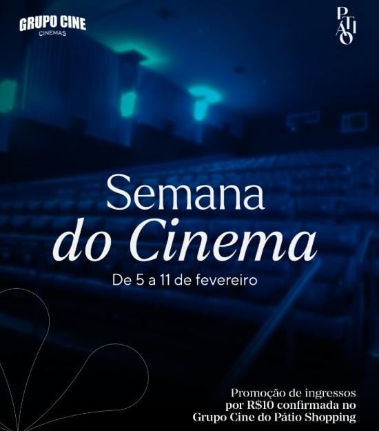 A partir desta quinta-feira, 5 de fevereiro, até a próxima quarta-feira, dia 11, o cinema no Pátio Shopping tem ingressos promocionais com variação de valor conforme o horário da sessão. Os preços definidos são de R$ 10,00 nas sessões durante o dia em salas 2D e 3D, e de R$ 12,00 nos demais horários. A iniciativa, que faz parte da Semana do Cinema 2026, vale para qualquer filme em cartaz.