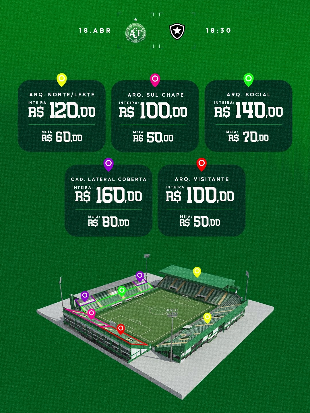 Arquibancada Descoberta (Ala Sul – CHAPE): R$ 100,00 | Meia-entrada: R$ 50,00