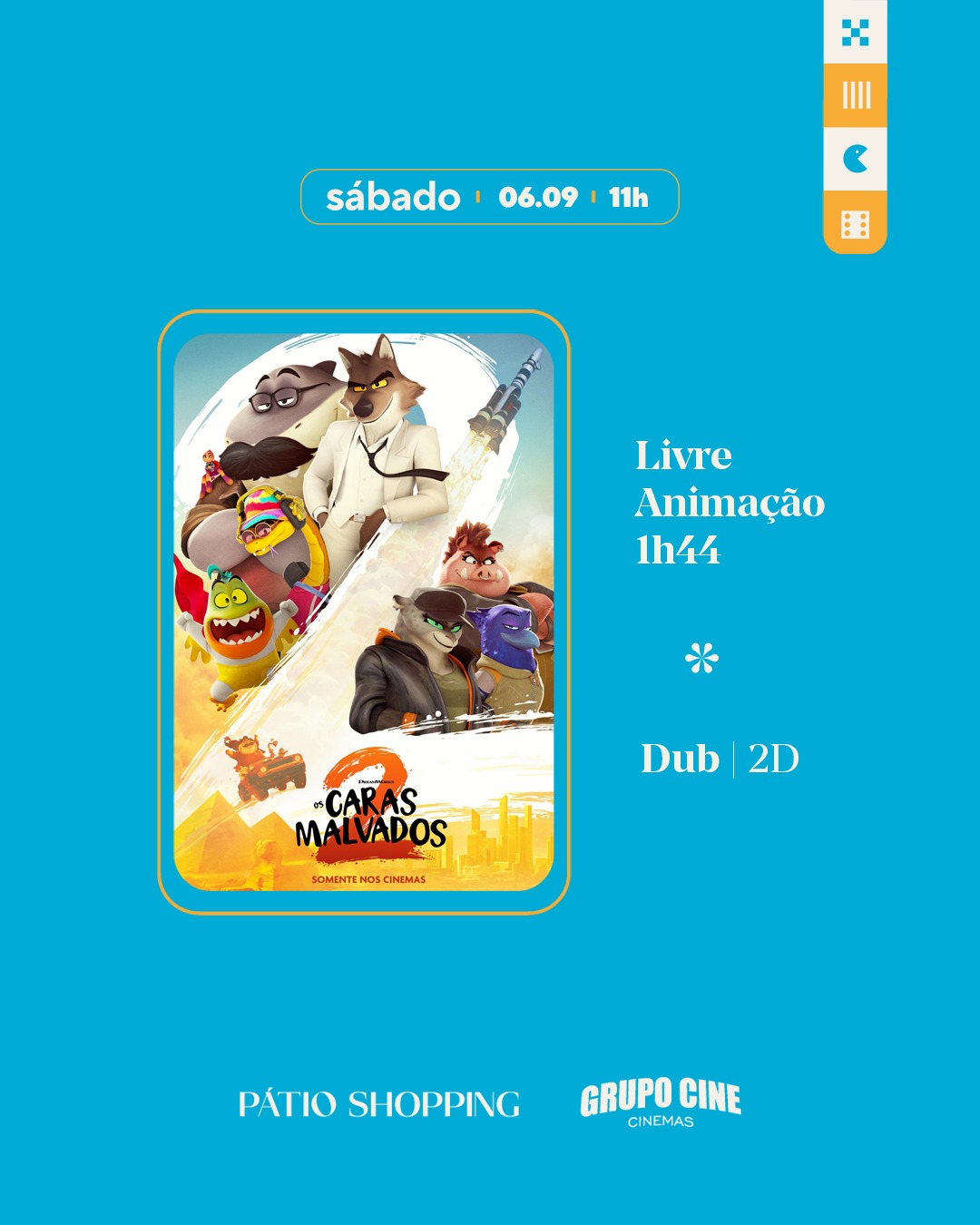 Em mais uma edição da “Sessão Azul”, uma das salas de cinema do Pátio Shopping exibirá o filme de animação “Os Caras Malvados 2”. A exibição ocorrerá neste sábado, 6 de setembro, às 11h.