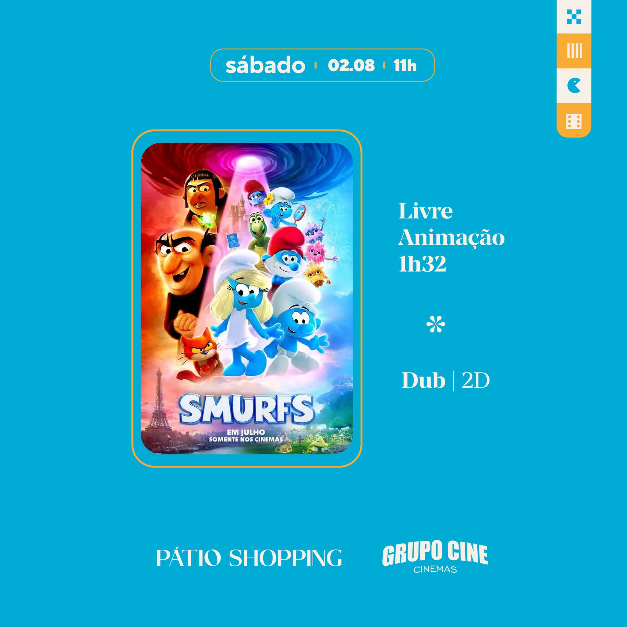 A nova aventura dos Smurfs vai ser exibida neste sábado, 2 de agosto, às 11h, em mais uma edição da Sessão Azul, no Pátio Shopping. Essa sessão, criada dentro do projeto “Pátio Amigo do Autista”, que torna o shopping um destino mais acolhedor para pessoas autistas ou com síndrome de Down, ocorre em um sábado de cada mês.