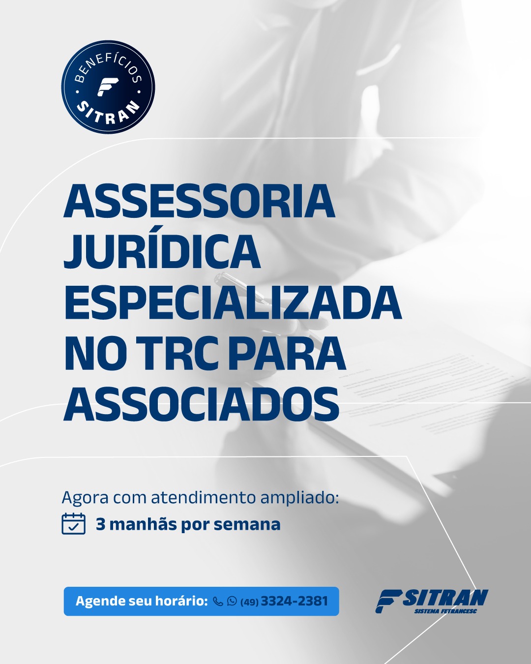 As empresas interessadas nos serviços da assessoria jurídica do Sitran devem agendar horário pelo WhatsApp (49)3324-2381. Sem custo, o atendimento envolve orientações no campo jurídico, em aspectos gerais, como suporte para elaboração de defesas administrativas de multas de trânsito, esclarecimentos sobre o transporte rodoviário de cargas e atualizações de mudanças no setor. Para questões específicas da empresa, o Sitran possui parceria com a TRC Vision, com custo especial aos associados.