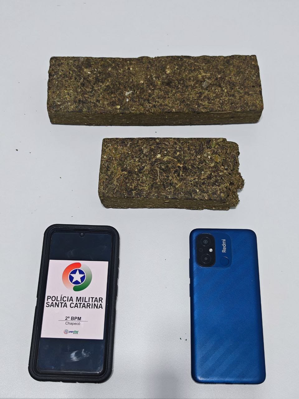 Foram apreendidos 1.018 gramas de maconha e um telefone celular. O suspeito foi encaminhado à Central de Polícia para as providências cabíveis.