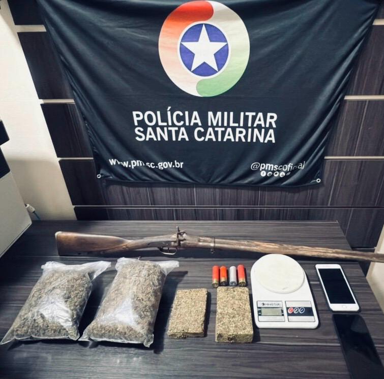No local, os policiais visualizaram uma arma de fogo na sala. O morador autorizou a entrada da equipe, que apreendeu a espingarda, quatro munições calibre 12, aproximadamente um quilo de maconha e uma balança de precisão. O irmão do suspeito, de 31 anos, foi preso por tráfico de drogas.