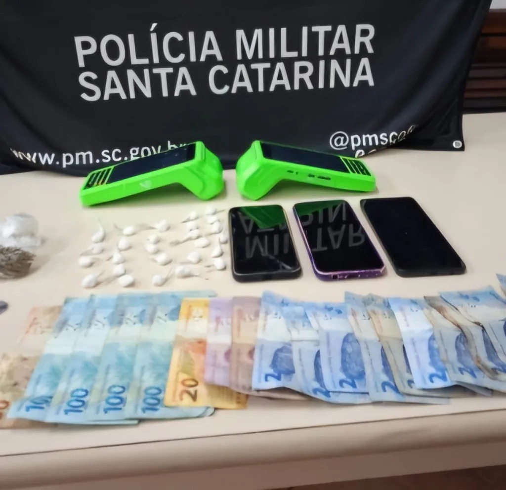 Durante as buscas no imóvel, a guarnição localizou porções de cocaína já fracionadas para comercialização, que totalizaram 15,4 gramas, além de 11,4 gramas de maconha. No local, também foram apreendidos aparelhos celulares, máquinas de cartão e dinheiro em espécie, itens que reforçam a suspeita de venda de entorpecentes.