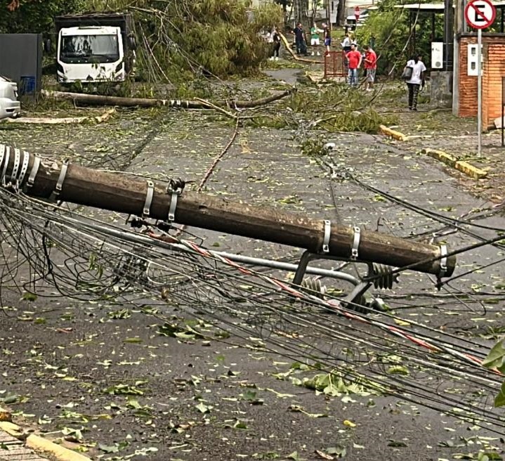 Na região próxima à delegacia, a força do vento e a queda das árvores provocaram inclusive a queda de postes, agravando a situação e exigindo atenção redobrada das equipes que atuam no local.