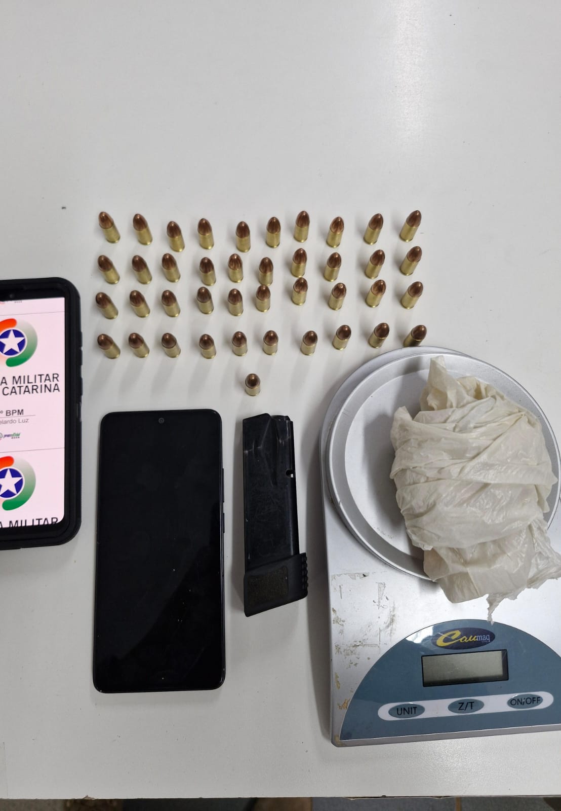 Enquanto atendiam a ocorrência, os policiais flagraram uma adolescente de 16 anos retirando uma mochila da residência do suspeito, a pedido da irmã, esposa do autor. Dentro do objeto foram localizados aproximadamente 100 gramas de crack, um carregador de pistola e 41 munições calibre 9mm.