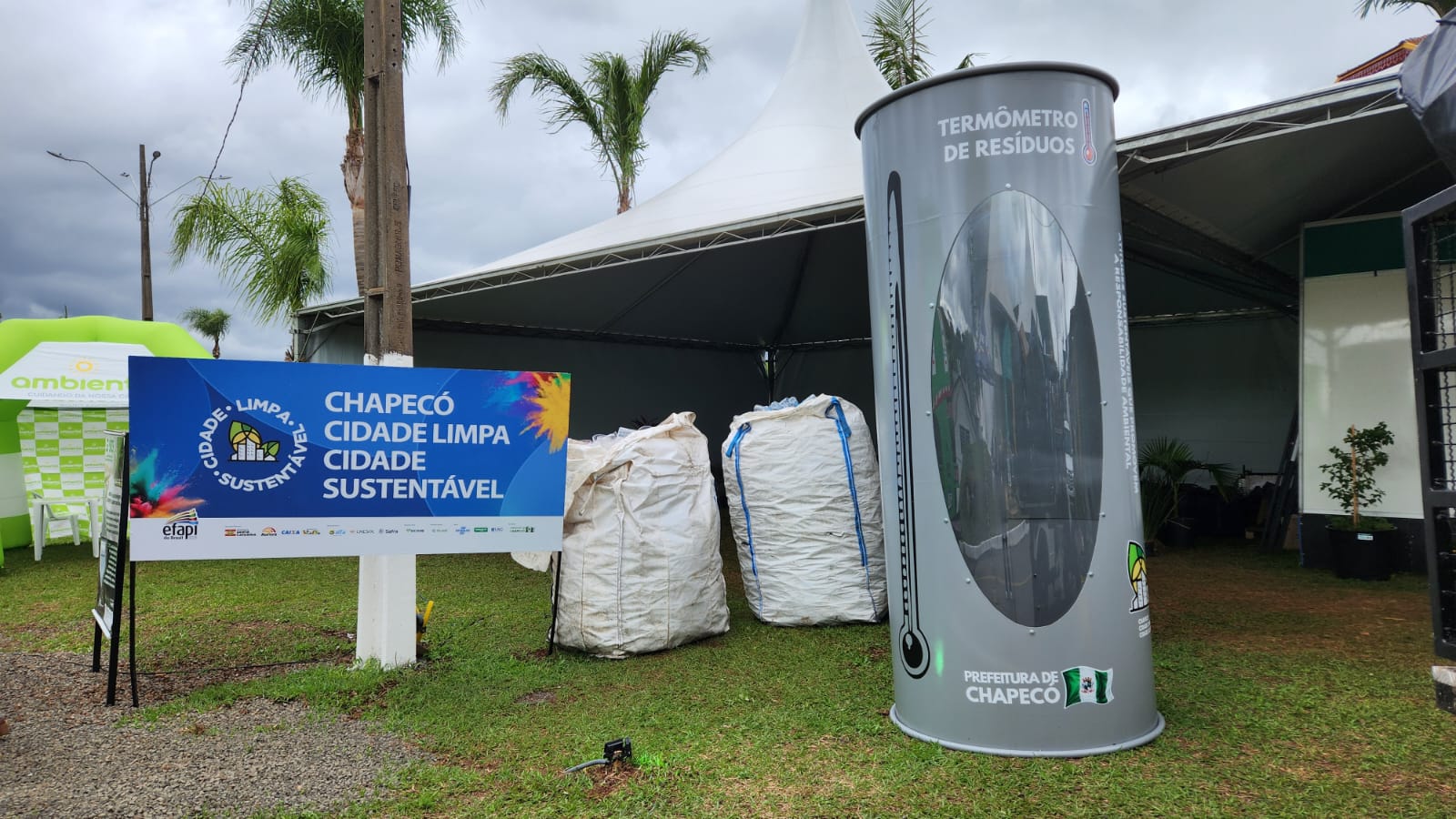 Nesta edição, existe uma outra novidade, o termômetro de resíduos da Efapi. Segundo a Graciela Heckler, o coletor foi pensado para realizar uma gincana que alia educação ambiental e consciência social. Ela explica que em determinados espaços de tempo, o sistema de som da feira convida as pessoas a se dirigirem até a base da Cidade limpa, com resíduos recicláveis variados, para depositar esses materiais no termômetro.