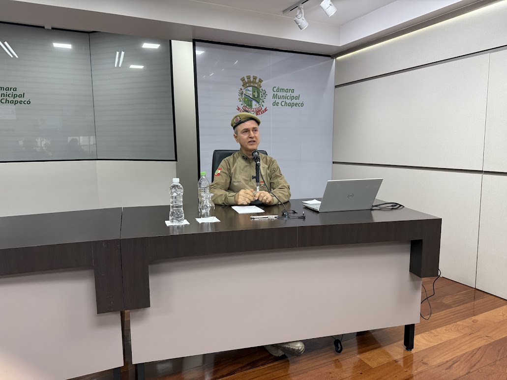 A Câmara Municipal de Chapecó recebeu, durante a sessão ordinária, a visita do comandante do Colégio Policial Militar Feliciano Nunes Pires – Unidade de Chapecó, Major José Luis Valério. A participação atendeu ao requerimento do vereador Wilson Cidrão (Republicanos) e teve como objetivo apresentar à comunidade o trabalho desenvolvido pela instituição de ensino no município.