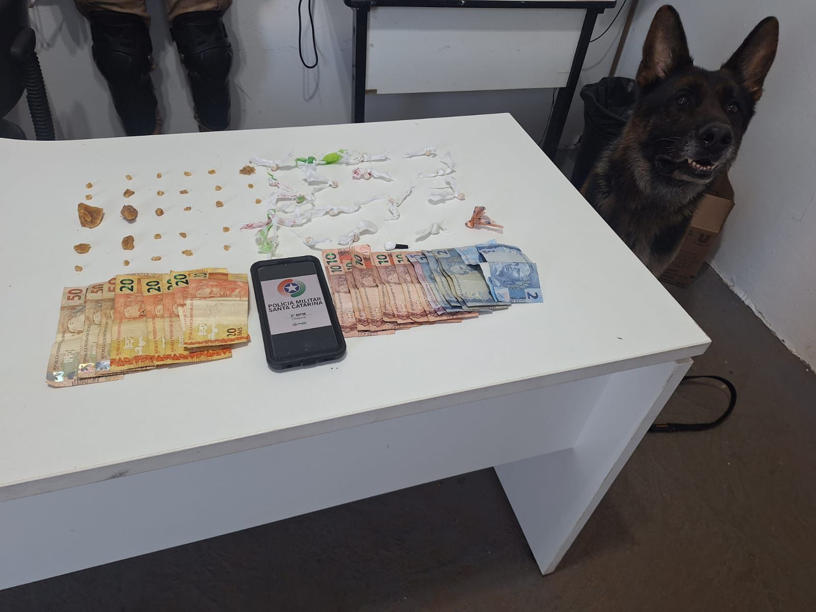 Com o apoio do Canil, a guarnição localizou em uma sacola plástica 28 gramas de substância análoga a crack, divididas em pequenas porções prontas para venda, e mais R$223 em notas fracionadas. O suspeito confessou comercializar crack no local, enquanto a cocaína seria para uso pessoal.