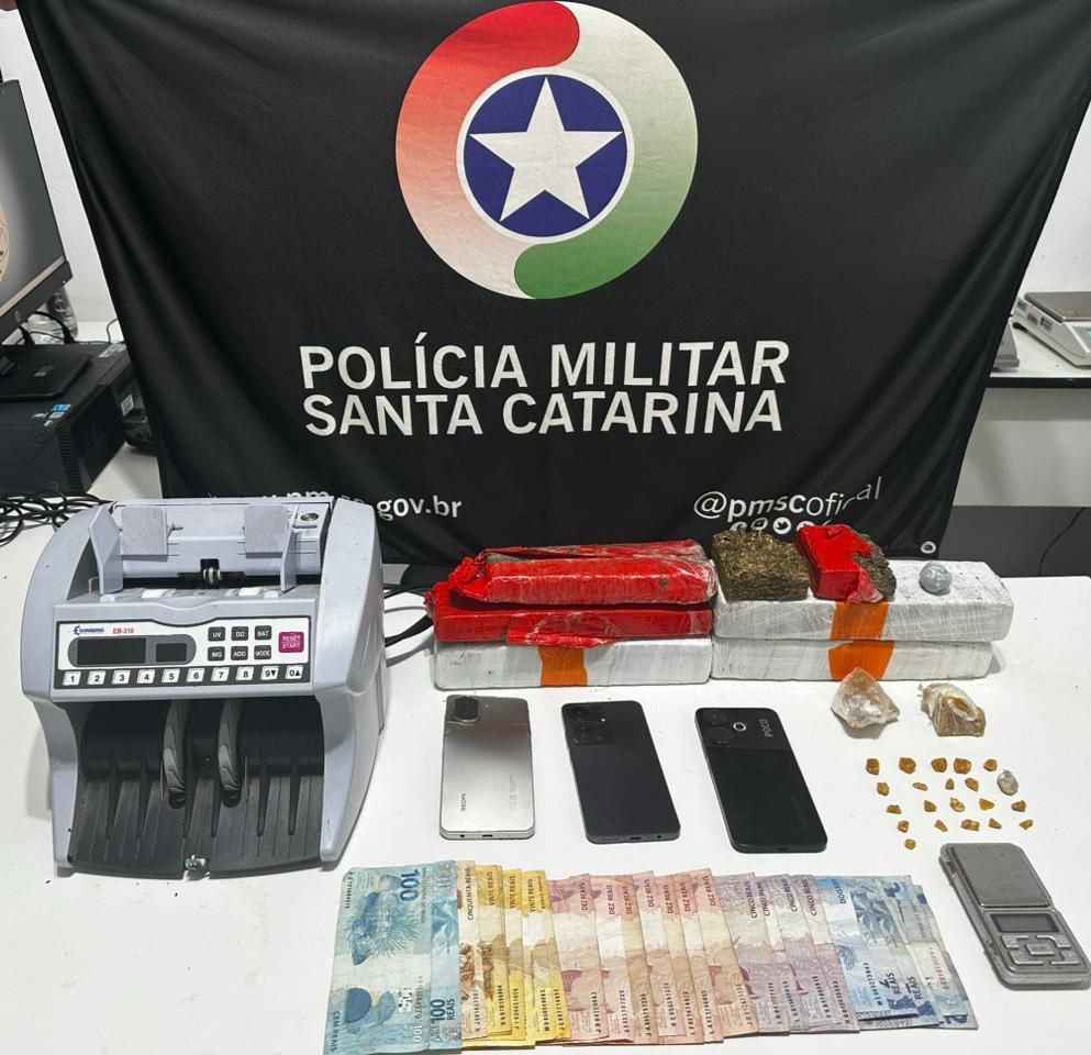 Durante as buscas no interior do imóvel, os policiais encontraram uma grande quantidade de drogas, incluindo mais de 3 quilos de maconha e porções de crack, além de uma balança de precisão, máquina de contar dinheiro e valores em espécie, itens característicos do comércio de entorpecentes. Três aparelhos celulares também foram apreendidos.