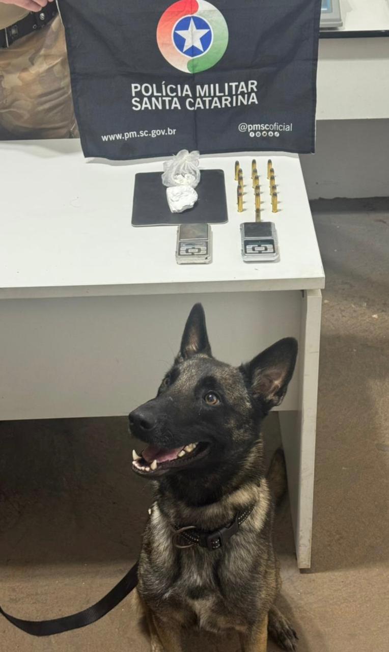 Durante a verificação no local, o suspeito negou a existência de drogas e autorizou a entrada da guarnição no estabelecimento. Diante de indícios de tráfico, foi acionado o apoio do Canil, que localizou aproximadamente 65 gramas de cocaína enterradas no terreno, além de 15 munições intactas de calibre .357 e uma munição calibre 9mm.