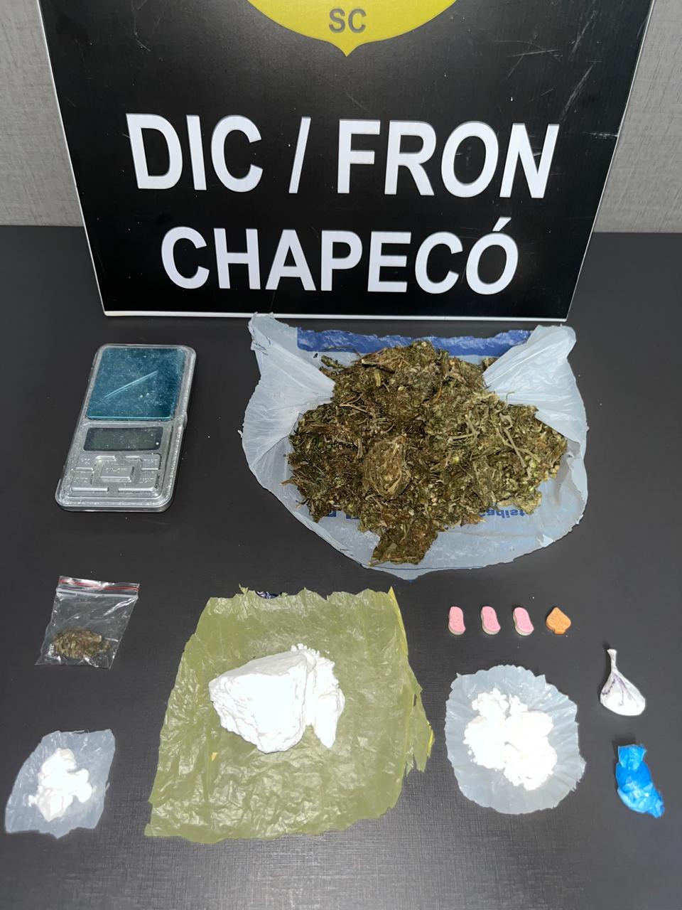 Ao todo, foram apreendidos cerca de 43,5 gramas de cocaína, 51,6 gramas de maconha, comprimidos de ecstasy, além de celular, balança de precisão e o veículo utilizado nas entregas.